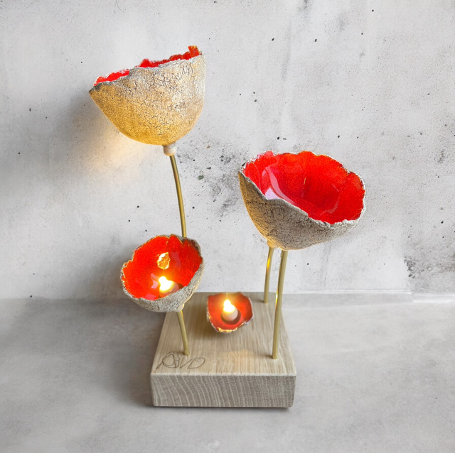 Création unique faite main dans notre atelier. Bouquet 5 corolles Émail rouge coquelicot. Hauteur environ 20cm Socle en chêne massif français 8x8cm. Éclairage par leds et alimentation par piles AAA.