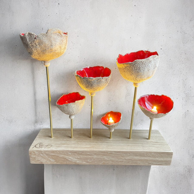 Bouquet 6 fleurs (émail rouge coquelicot). Hauteur : 15cm. Socle en chêne massif français 6x20cm. Éclairage par leds et piles AAA. Création unique faite main dans notre atelier.